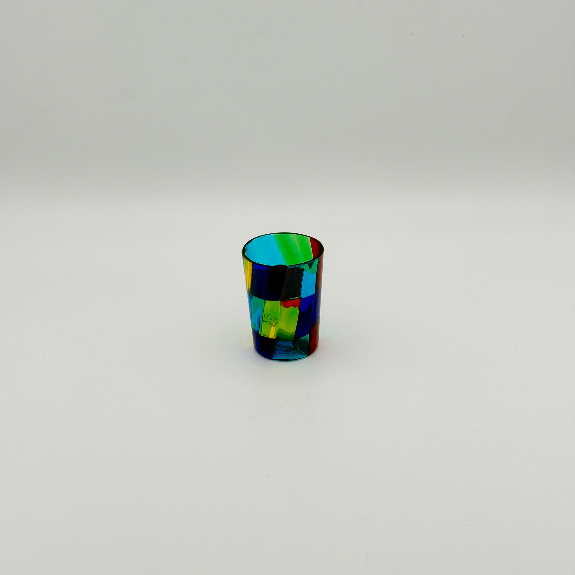 Master glassmaker Angelo Ballarin has handcrafted this set of six shot glasses by artfully assembling Murano glass tiles in a vibrant mix of colors. Dominated by shades of blue, the design evokes the hues of the sea—an inspiration behind the Acquamarina name. The palette includes aquamarine, blue, yellow, green, red, and orange, creating a lively and harmonious blend.