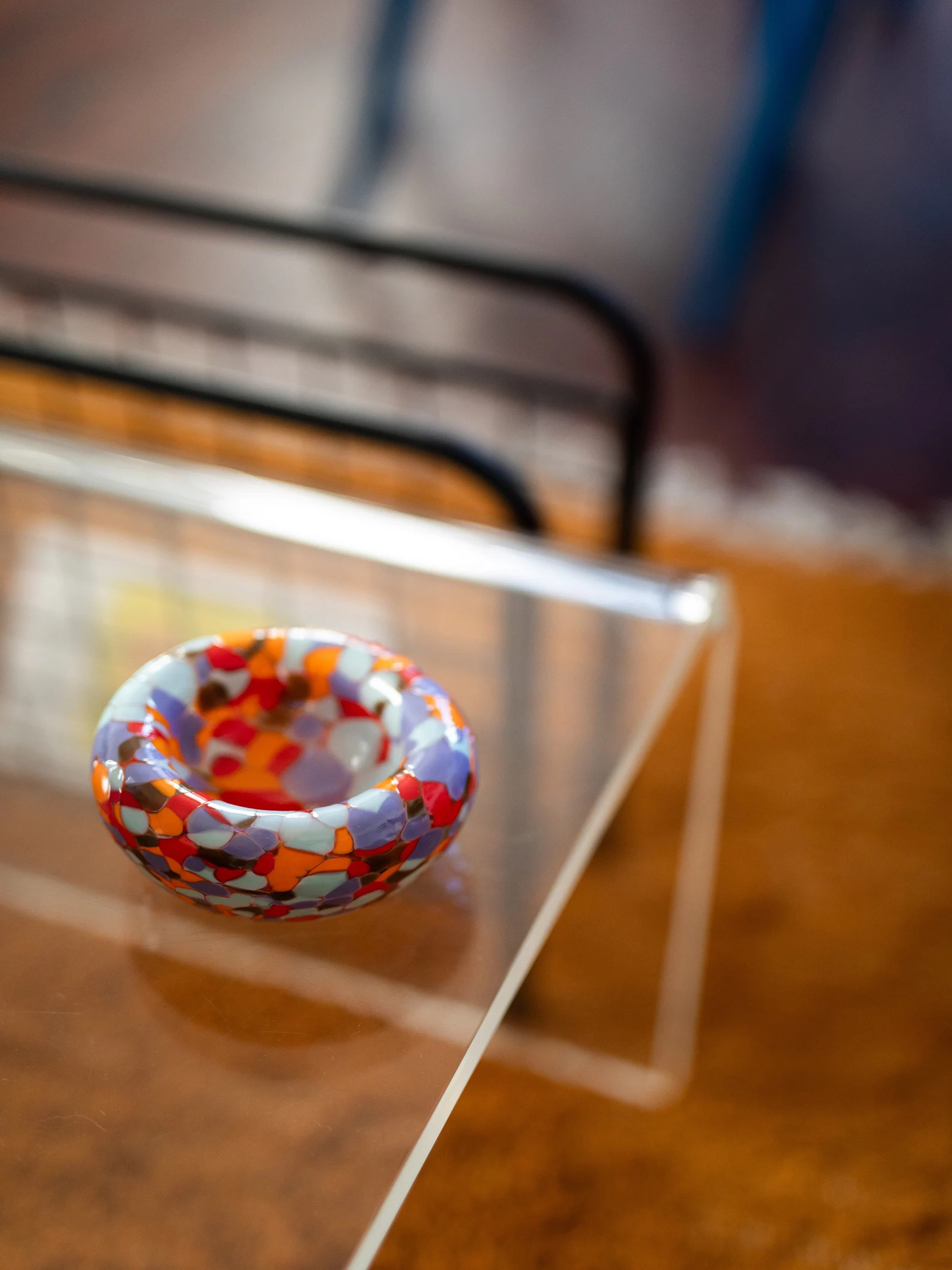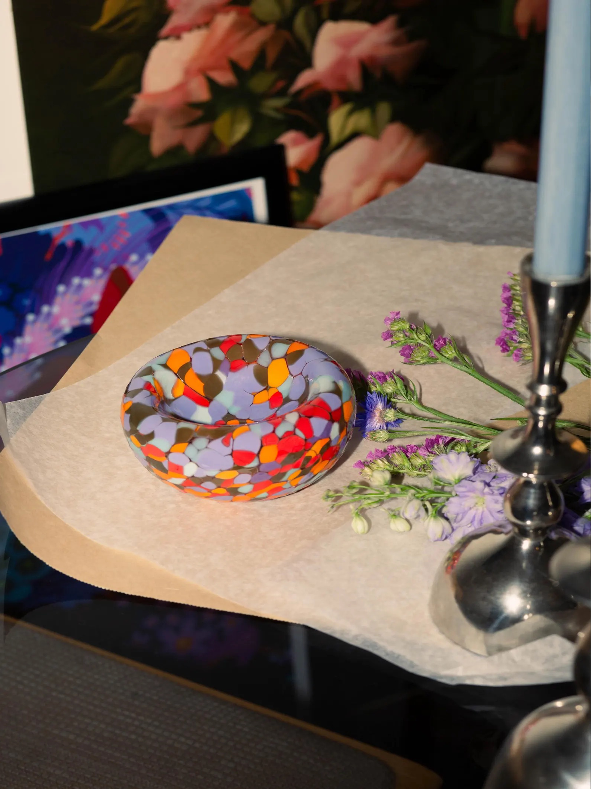 Please note that the bowl you receive may not be the exact one pictured, but a unique piece with a similar design, as each is one of a kind. This vibrant glass bowl, inspired by Jelly Baby candies, is a delightful fusion of color and artistry. A truly one-of-a-kind addition to your home—perfect for holding a pair of earrings, a ring, or other small treasures!