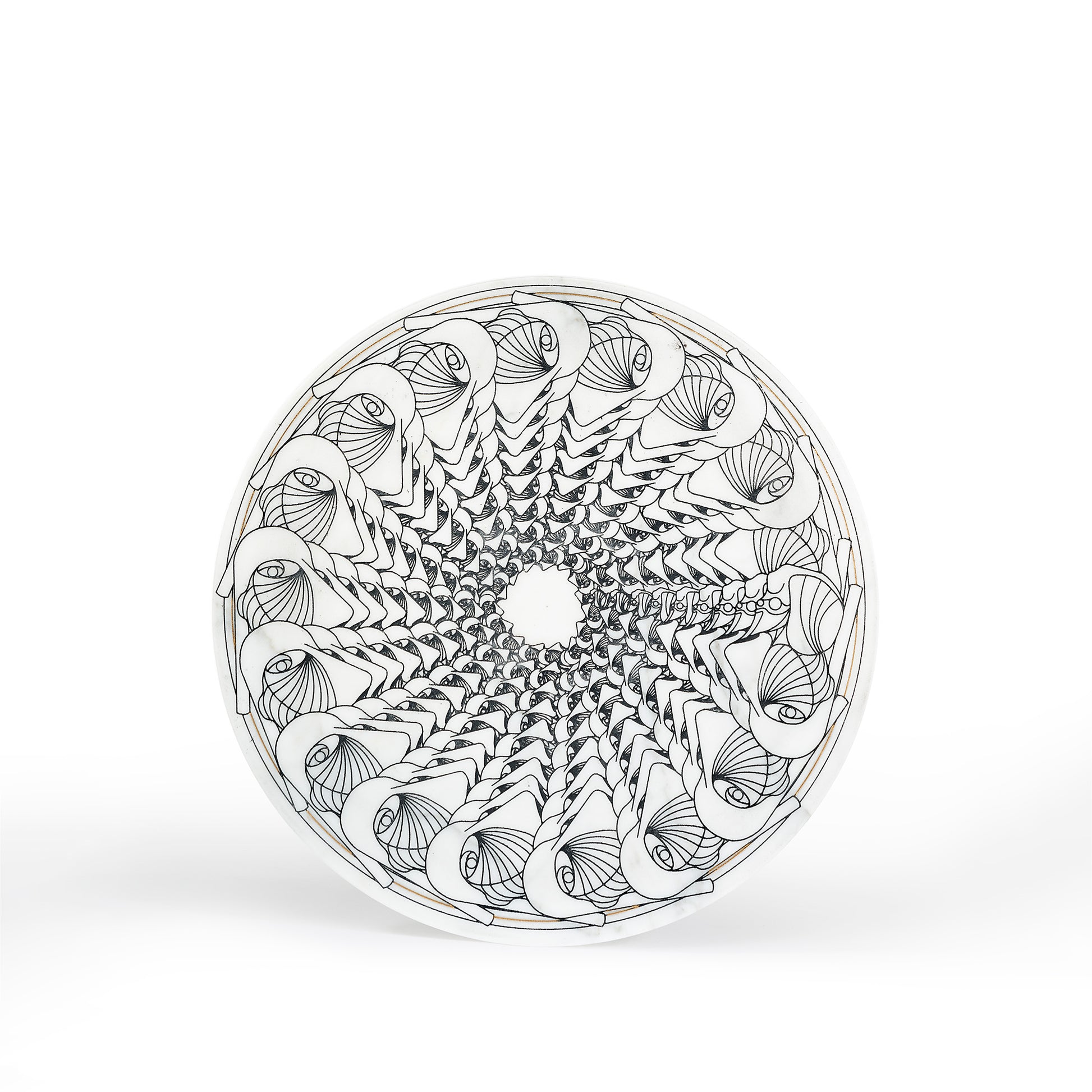 A multitude of faces that run in a spiral is the customization of Marblelous III, featured on a Marquinia marble round plate. It can be used as a serving or a hanging plate and it’s part of the homonym collection.