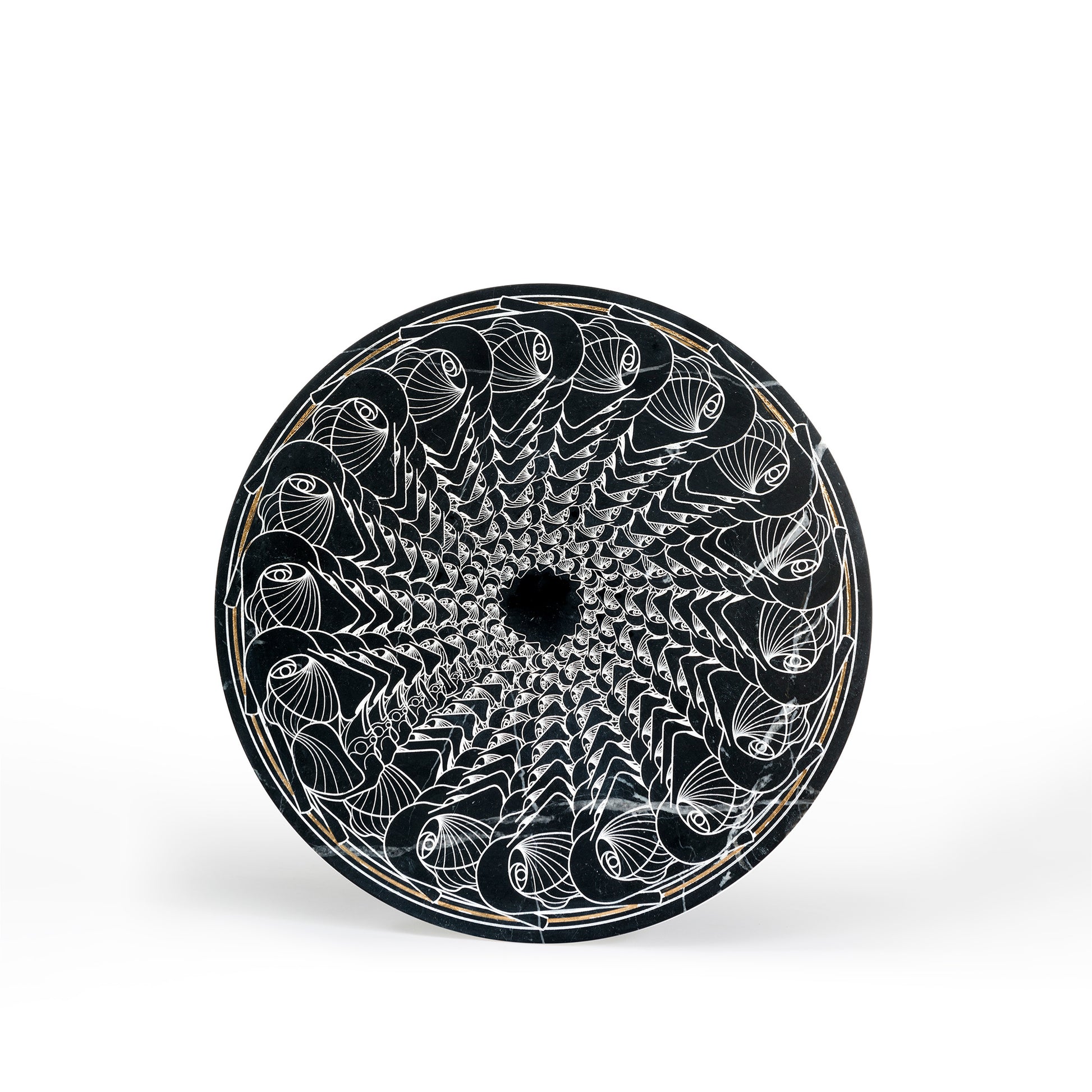 A multitude of faces that run in a spiral is the customization of Marblelous IV, featured on a Marquinia marble round plate. It can be used as a serving or a hanging plate and it’s part of the homonym collection.