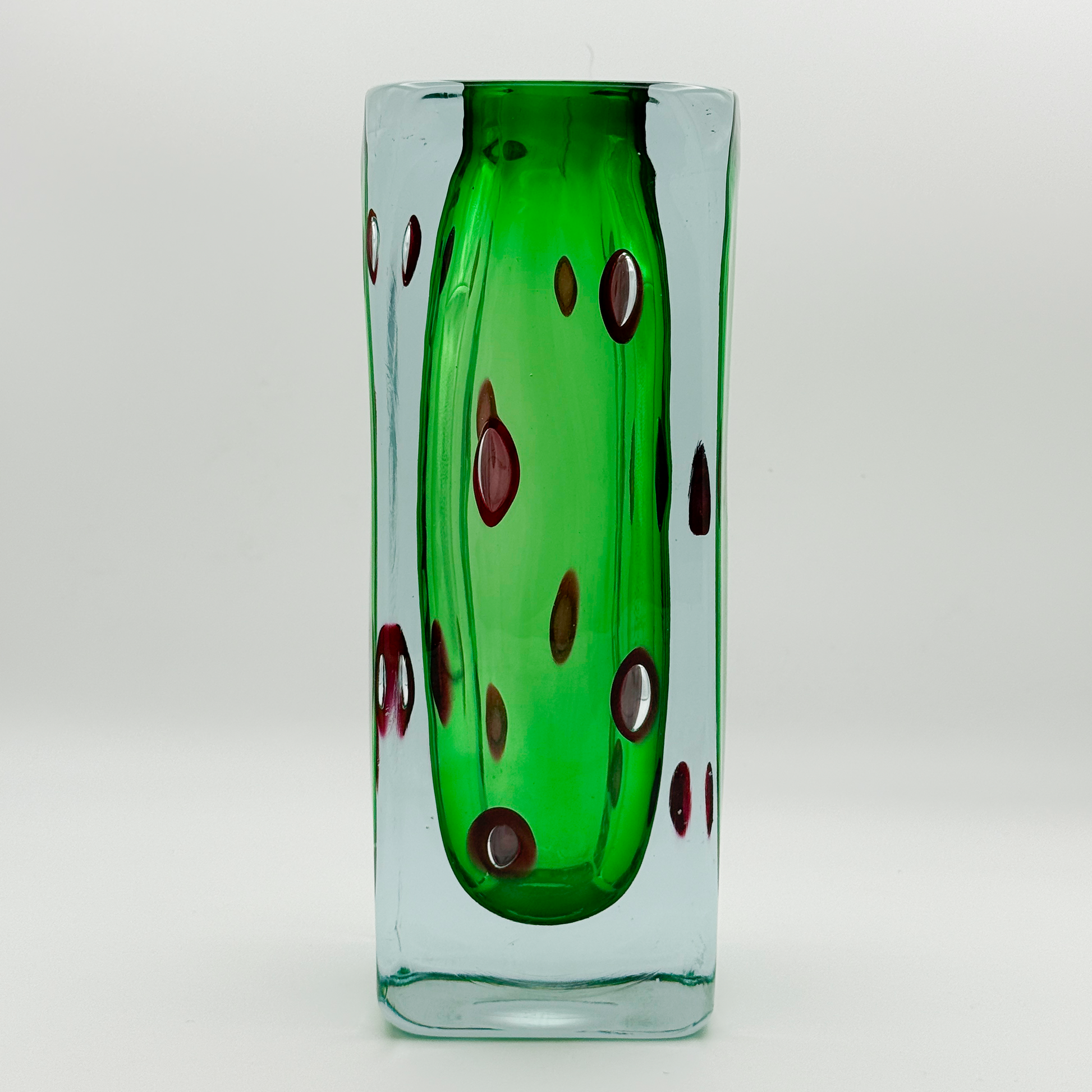 A captivating piece of mid-20th-century Murano artistry, this hand-blown vase features a vibrant green core encased in clear glass, punctuated by organic black and aubergine-colored spots. Its rectangular silhouette is softened by gently curved corners, creating a modern yet playful visual rhythm. The interplay of color and transparency showcases the technical mastery and bold experimentation characteristic of Murano glassmakers during this era. A striking decorative object with sculptural presence and timeless appeal.